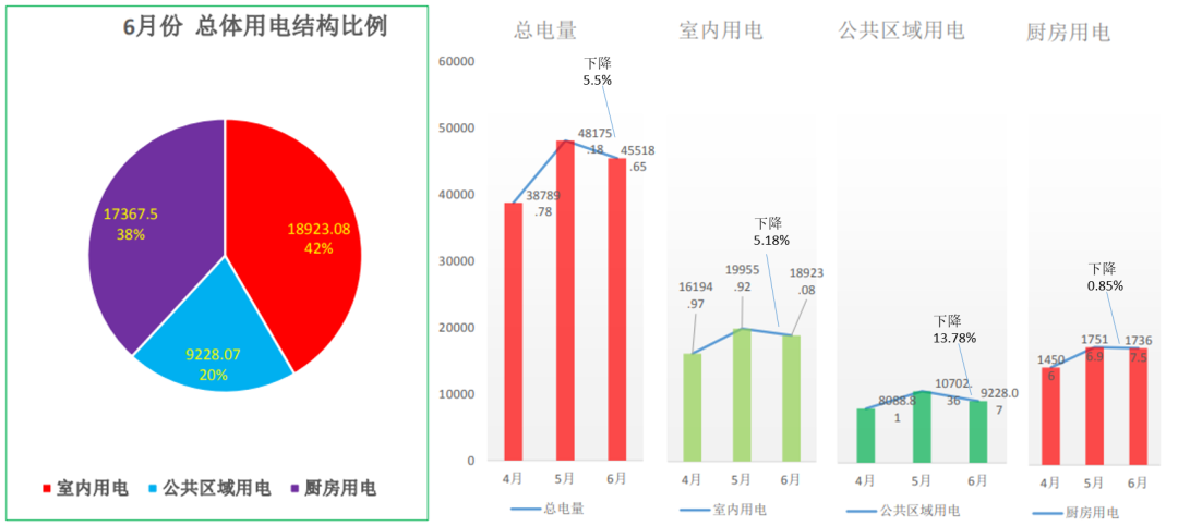 由上圖可看出,集團6月份總用電量比5月份降低了5.5%,其中,室內用電下降5.18%,公共區域用電量下降13.78%。