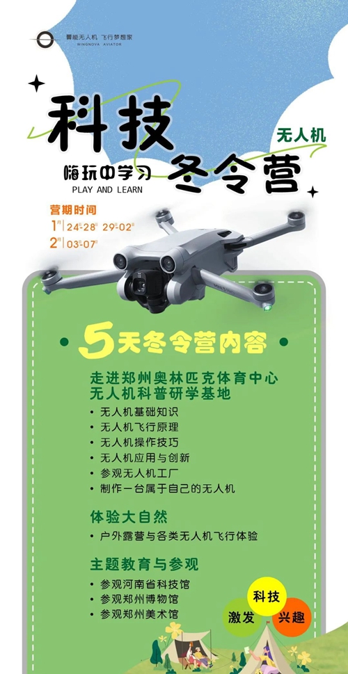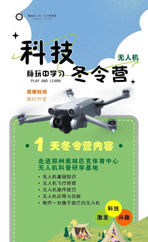 鄭州奧體翼能無人機研學基地是集無人機科普、研學、開發、應用、賽事運營的綜合服務平臺,不僅擁有1000余平方米的無人機科普教育基地,還擁有無人機駕駛執照的培訓資格。寒假期間,依托鄭州奧體中心開闊場館,翼能無人機將科普知識與實操表演完美結合,分別開設1至5天不等的科技冬令營,代領孩子們放飛科技夢,在嗨玩中學習。