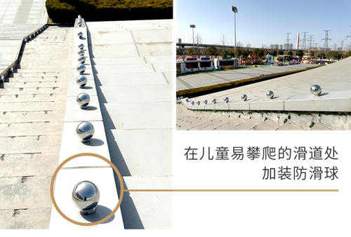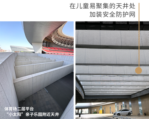 快樂成長,安全為先。為了確保兒童游樂區的安全,鄭州奧體中心從細節處著手精心加裝了多種防護裝置,在奧體中心西北角區域加裝隔離花箱、石墩,確保行人與機動車分離。同時,在體育場二層平臺兒童聚集較多的天井內,加裝防護網;在健身器材一側加裝防護欄;在通往二層平臺的步梯兩側加裝防滑球......這些防護裝置均經過嚴格的現場論證和質量檢測,確保其具有優異的耐用性和穩定性。通過這些措施,鄭州奧體中心致力于為孩子們打造一個既充滿樂趣,又安全無虞的游樂環境。