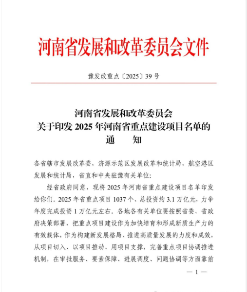 1月20日,河南省發(fā)改委發(fā)布《2025年河南省重點建設(shè)項目名單》。城發(fā)·高新生物經(jīng)濟(jì)產(chǎn)業(yè)園名列其中,入選2025年河南省重點建設(shè)項目。2025年省重點項目1037個、總投資約3.1萬億元,力爭年度完成投資1萬億元左右。