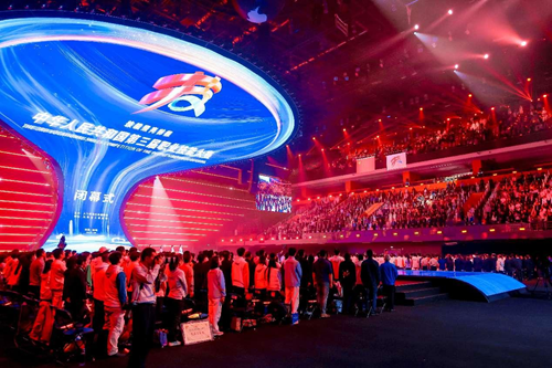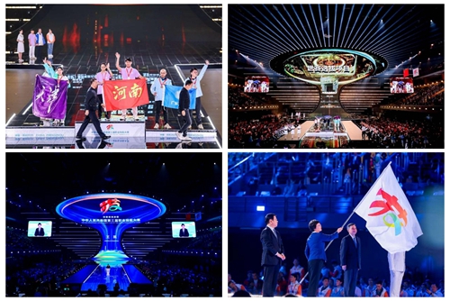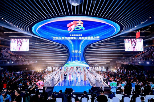 華燈璀璨,掌聲如潮。9月23日晚,當(dāng)348名獲獎(jiǎng)選手高舉隊(duì)旗與獎(jiǎng)?wù)?,?dāng)大賽會(huì)旗在璀璨的舞臺(tái)上完成交接傳遞,當(dāng)良渚文化和人形機(jī)器人在現(xiàn)場8000余名觀眾的歡呼聲中共舞……中華人民共和國第三屆職業(yè)技能大賽閉幕式在鄭州奧體中心體育館完美落幕!