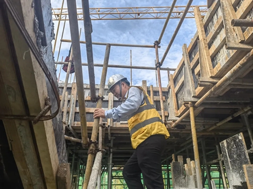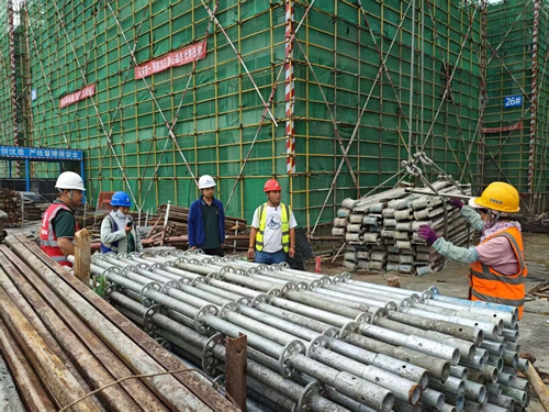 來到3樓頂板上方,工人們正搭建防護網。“他們是這個工作面的開荒者,危險系數最大。”葉劉杰說,只有防護網搭建完畢,木工、鋼筋工等不同班組才能陸續入場施工。仔細查看每道工序,并對當班工人叮囑一番注意事項后,葉劉杰才放心離開。
