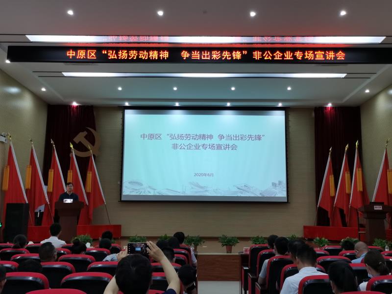 為充分發揮中原新區聯合黨委基層黨校在黨的理論教育上的主陣地作用和在黨性教育上的大熔爐作用,在黨校中弘揚習近平總書記給圓方集團職工的重要回信精神,真正使聯合黨委基層黨校成為黨員干部思想政治教育的紅色殿堂,6月5日和9日,中原區“弘揚勞動精神 爭當出彩先鋒”企業、班組專場及非公企業專場宣講會在中原新區聯合黨委基層黨校舉行,中原區委組織部組織科科長蔚光勛、西流湖公司副總經理昌磊出席活動,共有來自中原區各街道辦事處、各企業的150余名黨員職工聆聽了宣講。